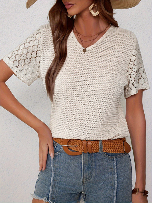 Elegant dames-T-shirt – V-hals, kanten details en korte mouwen